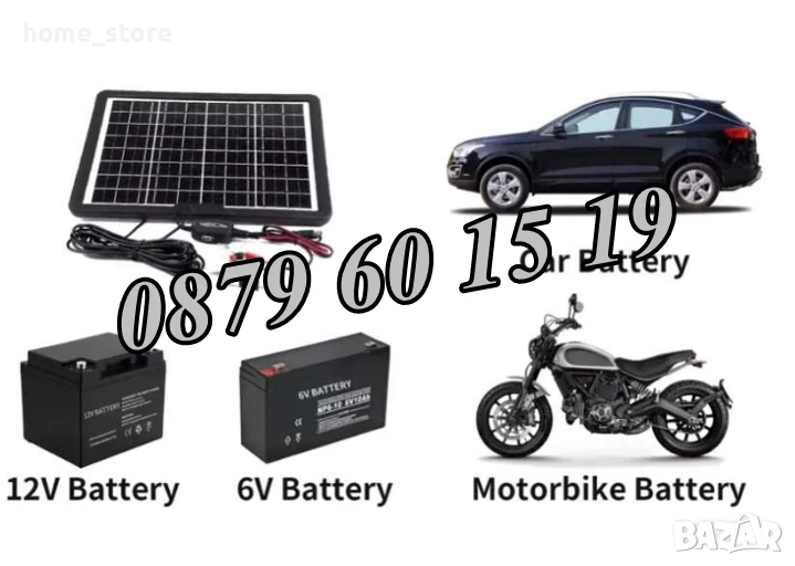 Слънчев панел за зареждане с USB слот и 5 зарядни глави за телефони от старо и ново поколение, преносими батерии, безжични колонки, 12V батерии, 5V прожектори.