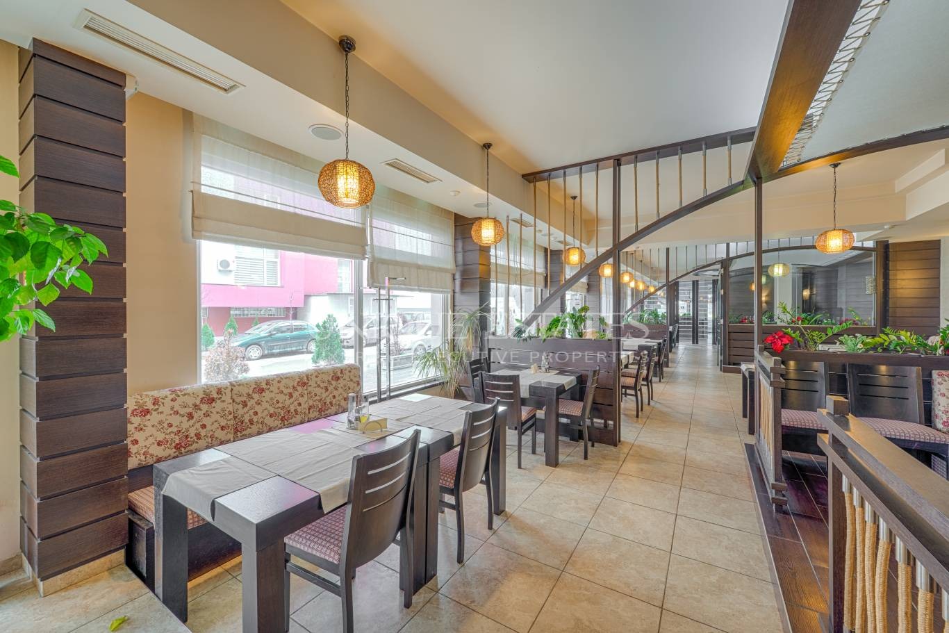 състои се от: три салона, кухня и няколко складови помещения, четири тоалетни и стая за персонал-офис. Голяма външна площ оборудвана с тента, ветроупорни завеси и външен детски кът.