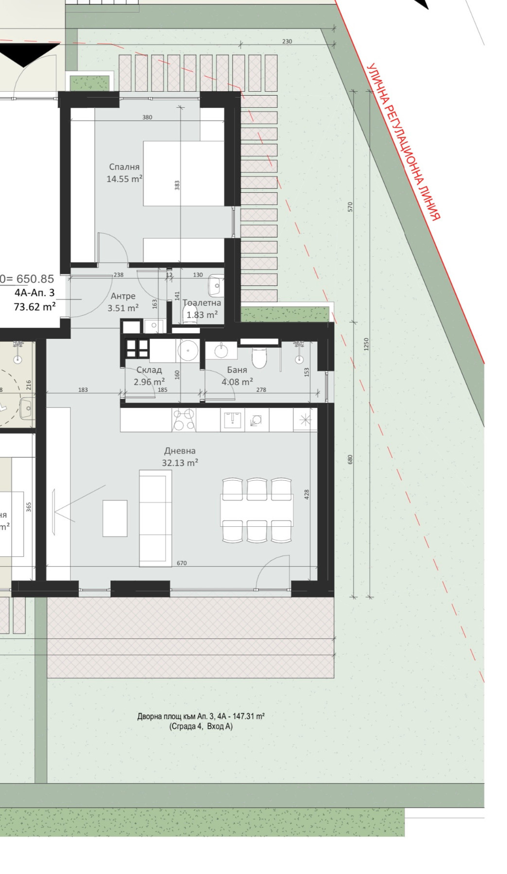 Двустаен апартамент в новострояща се сграда до София ринг мол и околовръстен път. Застроената площ от 74 кв.м. е разпределена между входно антре, просторна дневна с кухненски бокс, спалня, баня. Двор към апартамента 150 кв.м. Изложение юг изток север . Сградата е част от затворен комплекс. Опция за закупуване на подземно паркомясто.За огледи 0988870990