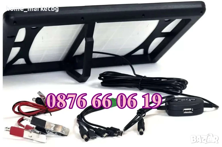 Слънчев панел за зареждане с USB слот и 5 зарядни глави за телефони от старо и ново поколение, преносими батерии, безжични колонки, 12V батерии, 5V прожектори.