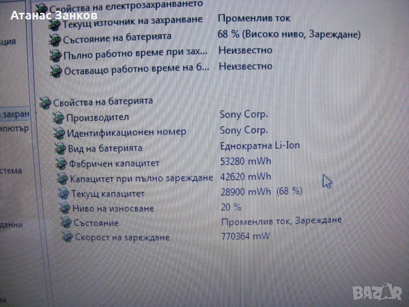 Батерията държи ток, 20% износване.