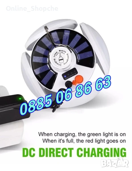 Мобилно осветление подходящо за къмпинг - Туристическа лед лампа-фенер соларна, зарежда се от слънцето, с вграден акумулатор, удобна за къмпинг, риболов и др.