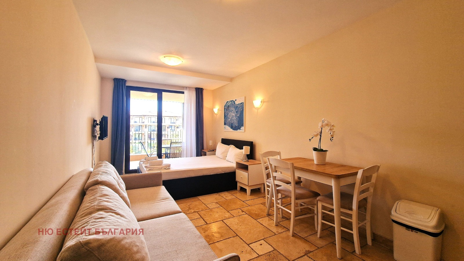 Светло и напълно обзаведено студио, разположено на втори етаж в престижния комплекс Калиакрия Ризорт, с. Топола. Имотът разполага с тераса с приятна гледка към басейна и зелените площи на комплекса.