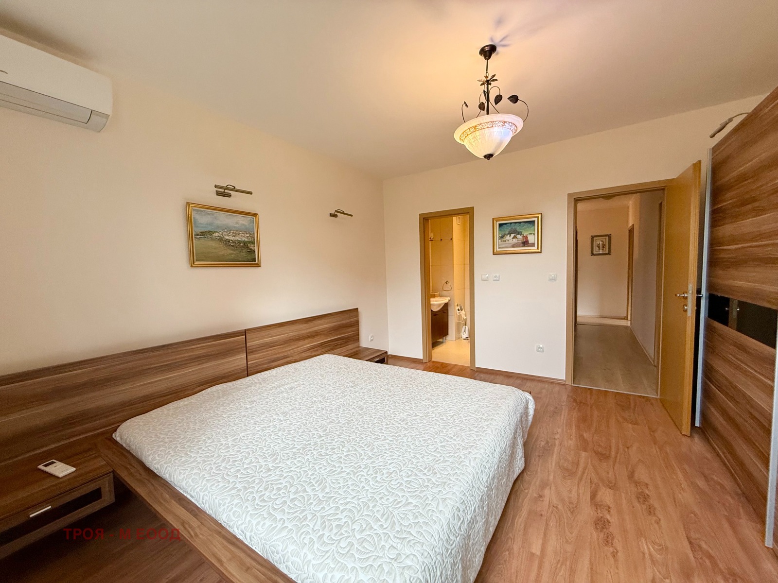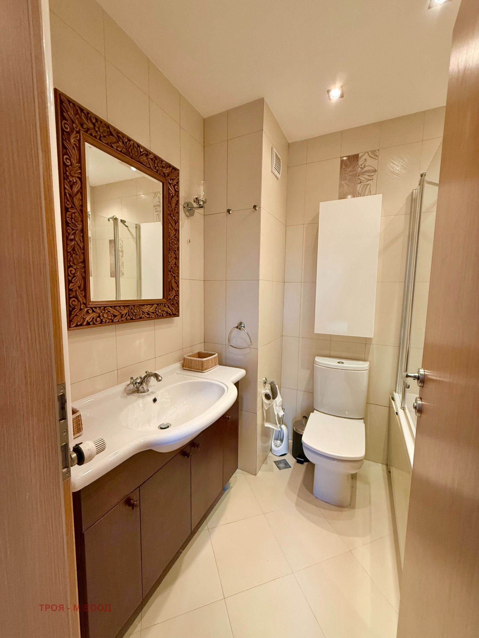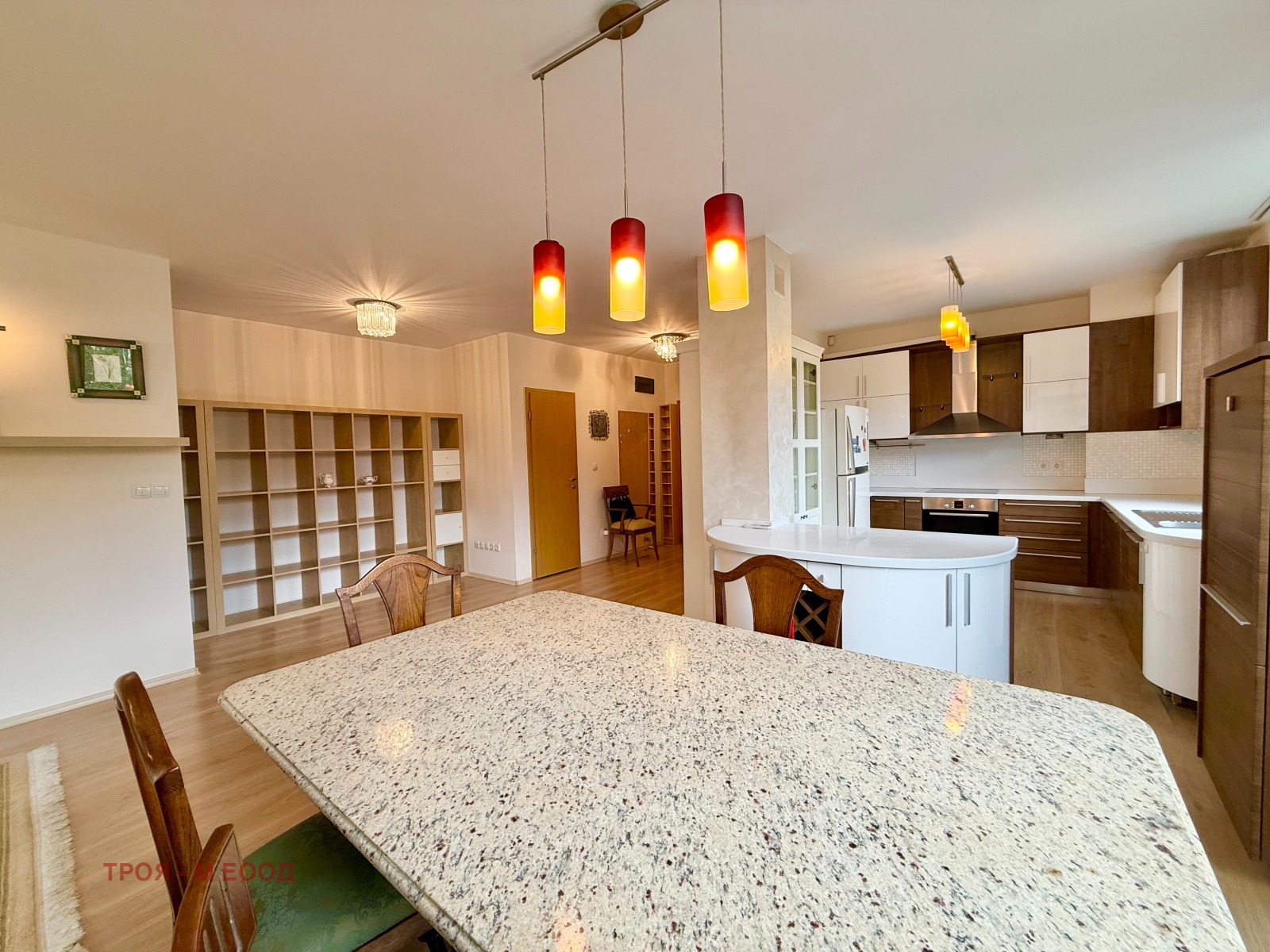 Жилището разполага с просторен хол с площ около 35 кв.м,напълно оборудвана кухня с всички необходими ел.уреди, три големи спални,2 бани с тоалетна,една самостоятелна тоалетна за гости,мокро помещение и три остъклени балкона. Апартаментът се отдава изцяло обзаведен.