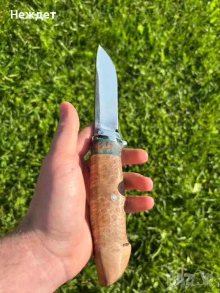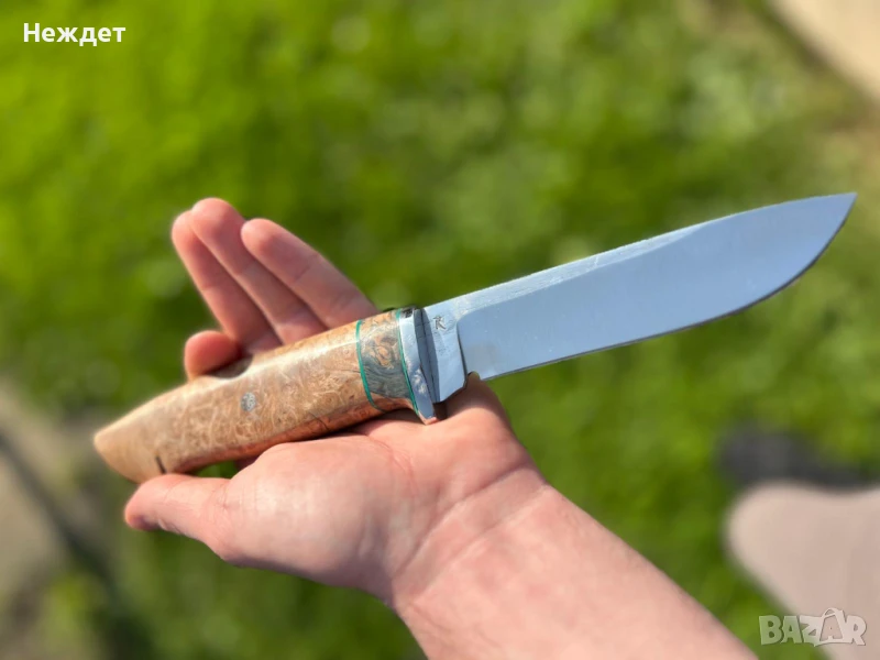 Нож от кована танкова шпилка. Размери на острието 130 /30/4мм.Дръжка от неръждаем гард и тумор от стабилизирана елша.