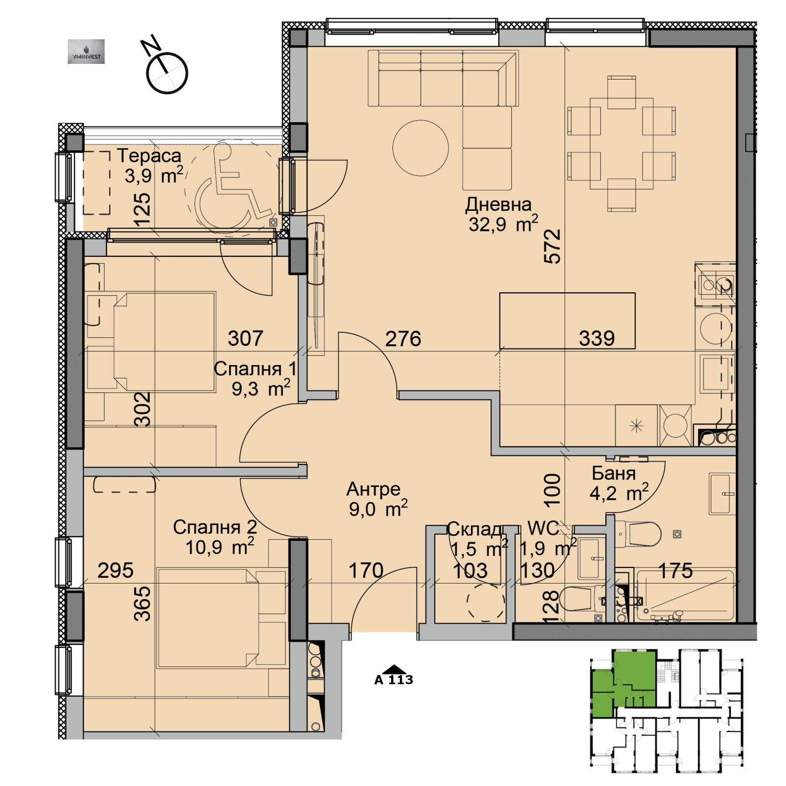 Апартаментът /Ап. 113/ е с площ от 101,77 кв.м. и е на четвърти етаж.