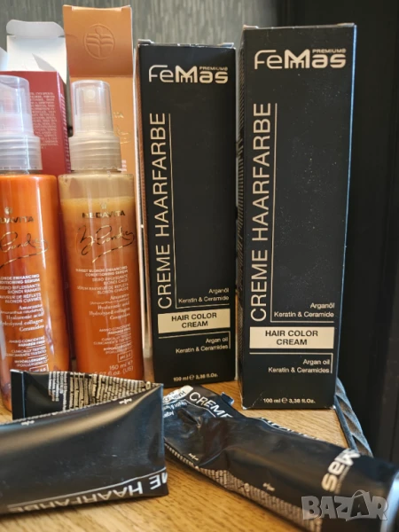 Нови купувала съм ги като резерва ,но смених цвета .Страхотни продукти за червенокоски .Маските подхранват и подържа цвета а спрея е без отмиване придава страхотни медно и златисти оттенъци ( не цапат Боите да професионални .Двете не са използвани .русо меден кехлибар и жълт пясък към тях подарявам две ползвани на половина златисти меден кехлибар и златен пясък .Огромен окислител към тях от него липсват 100 гр В допълнение спирала за вежди на нас за руси и рижави както и страхотни сенки с цвят подходящ за тях само те са пробвани веднъж