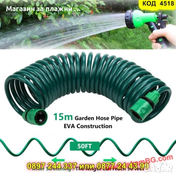 Разтяга се до 15 м, прибира се сам – спираловидната форма елиминира нуждата от навиване