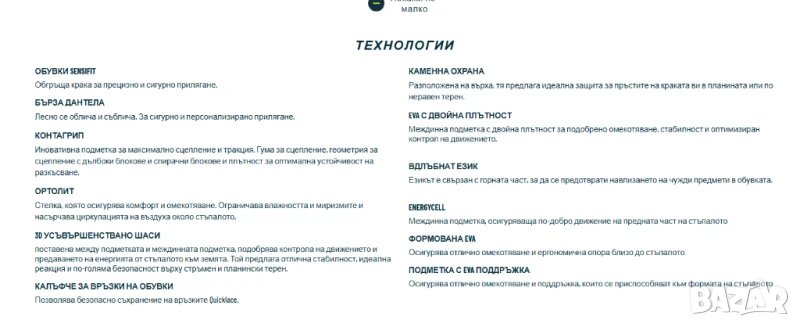 стелка: антимикробна основа Agion™ ; EVA пяна – осигурява отлична подплънка и поддръжка по време на носене