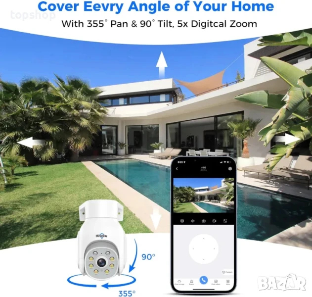 Автоматично проследяване и PTZ дистанционно: WiFi камерата може да проследява автоматично, когато открие човек, продължава да записва, докато човекът излезе от зоната за наблюдение. Камерата със 120-градусово зрително поле, 355° Pan 90° Tilt може да защити по-широка зона около къщата ви.