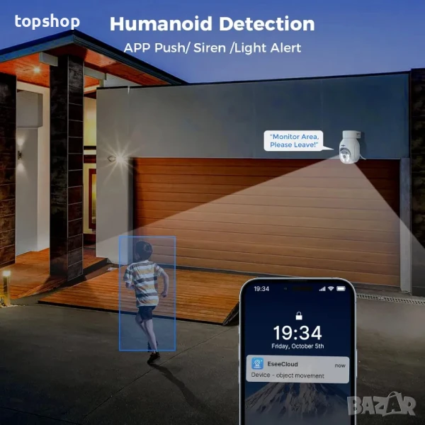 Двупосочна аудио и светлинна/сиренена аларма: Когато интелигентната камера открие засичане на движение, тя ще включи светлинна или сиренена аларма, за да изплаши нежелани хора. Можете да говорите с други хора в обхвата на наблюдение чрез APP на вашия телефон.