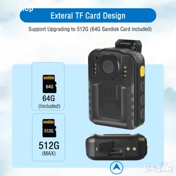 Гъвкави камери с дизайн на паметта. Дизайнът на външната TF карта ви позволява да надграждате до по-голяма памет (максимум 512 Gb) сами по всяко време и навсякъде. Предлагаме 1 висококачествена Sandisk 64GB карта в пакета, достатъчна за 20 часа 1080P HD видео или 10 000 снимки на изображения. Също така с нашия четец на TF карти можете да възпроизвеждате файлове на всякакви компютърни системи, Windows, Mac, Chromebook или дори Linux.