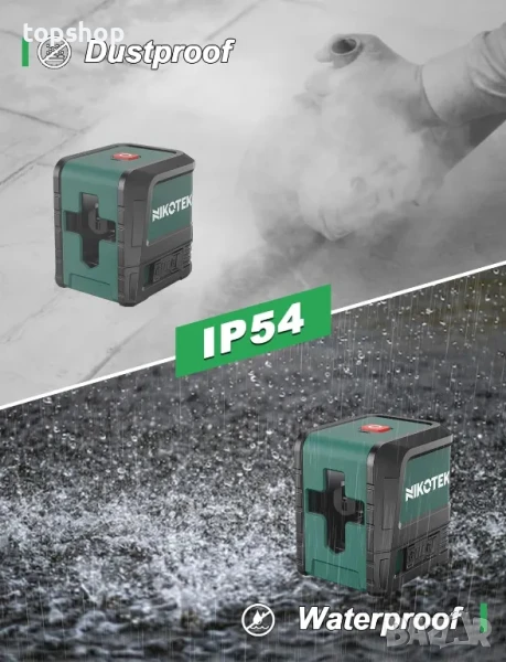 ✦Висока степен на видимост и защита: Кръстосаният зелен лазерен нивелир разполага със зелен лазерен лъч с висока видимост, който е по-ясен и видим в сравнение с червените лазери. Той също така може да се похвали със степен на защита IP54, което го прави водоустойчив, прахоустойчив, удароустойчив и устойчив на износване. Издръжливият и висококачествен удароустойчив корпус осигурява до 1 м защита от сблъсък, осигурявайки надеждна работа дори в предизвикателни работни среди.