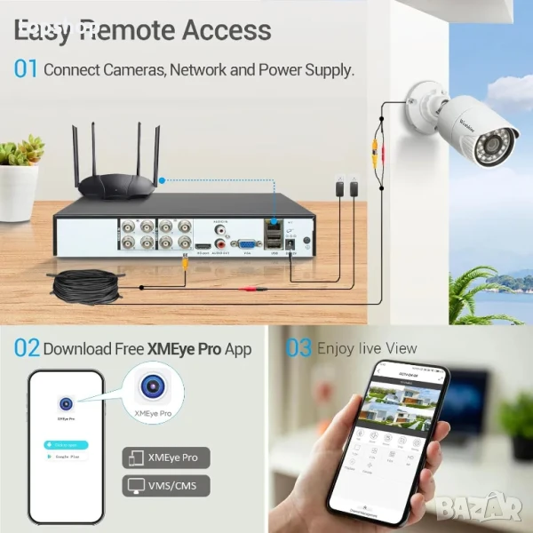 P2P облачно дистанционно управление: Поддържа облачна услуга, P2P функция и лесно дистанционно управление. Разрешете гледане на живо не само във вашата домашна мрежа, но и извън нея. Много е удобно да гледате чрез безплатното приложение XMeye Pro на вашия смартфон и таблет (Android & iOS)