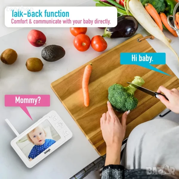 - Интерком функция: вграденият висококачествен микрофон и ясният високоговорител ви помагат да общувате директно с вашето бебе, когато има нужда от вас. Видео и аудио в реално време, за да знаете, че бебето ви е в безопасност