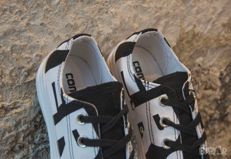 Почти всяка цветова гама, която можете да си представите, е пусната през годините, но никоя не е толкова смела, колкото тази ексклузивна надпис „ за All Star. Гигантски надпис по страничната стена моментално грабва вниманието. В черна цветова гама, това е перфектният контраст с изцяло белите горни части. За да балансират визията, обикновената междинна подметка е допълнена от други емблематични детайли, като например логото на Converse, което се намира както на езика, така и на петата.