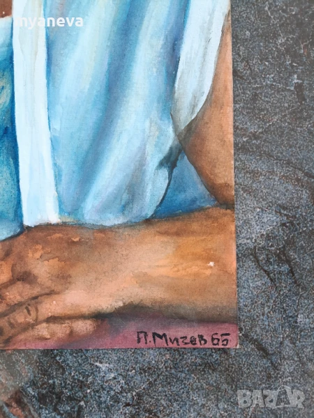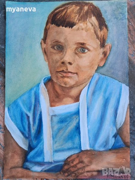 Стара картина , портрет на момче с акварелни бои върху картон в рамка. Подпис П.Мичев , 65 г. Размер с рамка 53 / 43 см. Цена 90 лв.