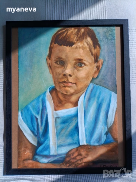 Стара картина , портрет на момче с акварелни бои върху картон в рамка. → Обява 50526620