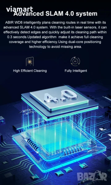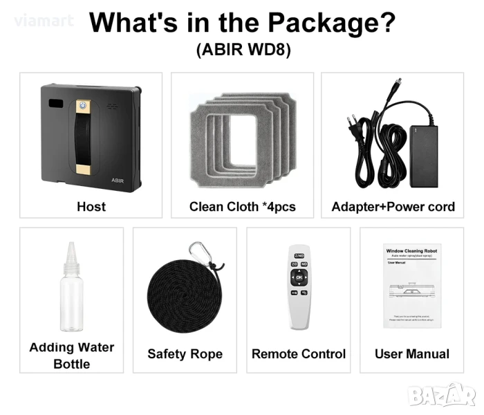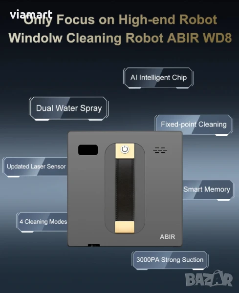 ABIR WD8 е уред за автоматично почистване на прозорци, огледала и гладки повърхности. Работи самостоятелно и е безопасен дори за безрамкови стъкла, благодарение на вградения лазерен сензор и интелигентна навигация.