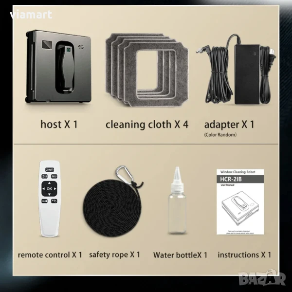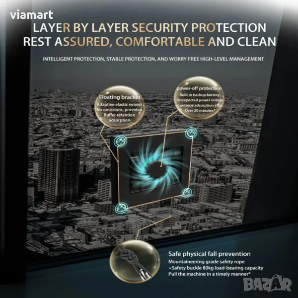 Моделът е оборудван с UPS защита, която го задържа върху стъклото до 30 минути при спиране на тока, както и с предпазно въже с товароносимост до 80 кг за максимална безопасност.