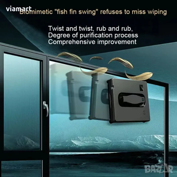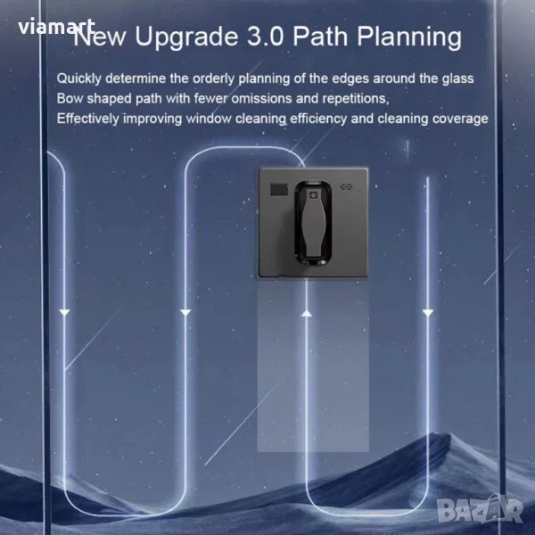 Роботът работи с всмукателна сила от 3200 Pa, което гарантира стабилно закрепване върху стъкла, огледала и гладки повърхности по време на работа.
