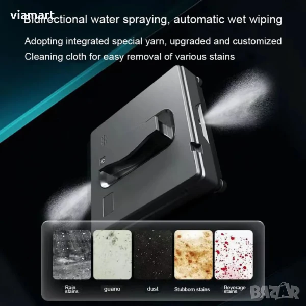 Роботът разполага с двустранна система за пръскане на вода, която може да работи автоматично или да се активира ръчно за още по-ефективно премахване на прах и петна.