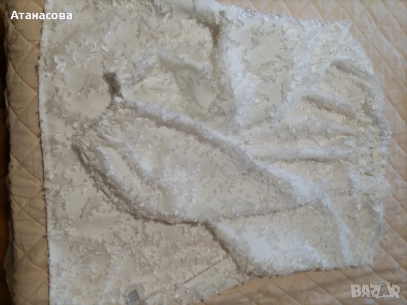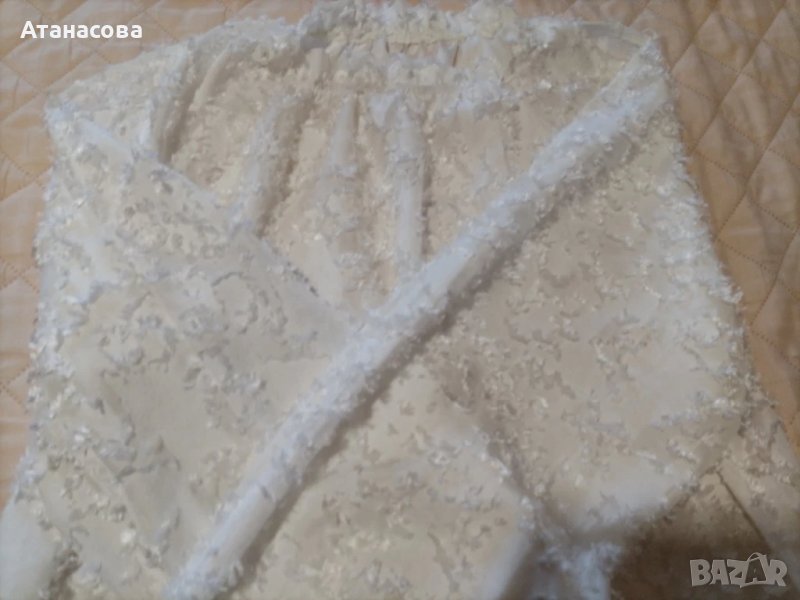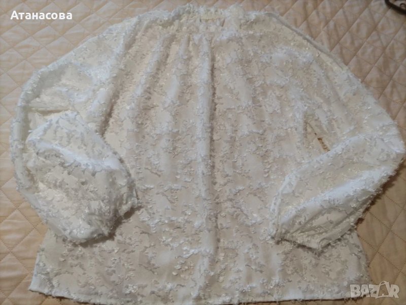 Продавам блуза с голи рамене, бял цвят, много интересна материя.Блузата е с цепки в горния край на ръкавите,което я прави много ефектна.Размер L.