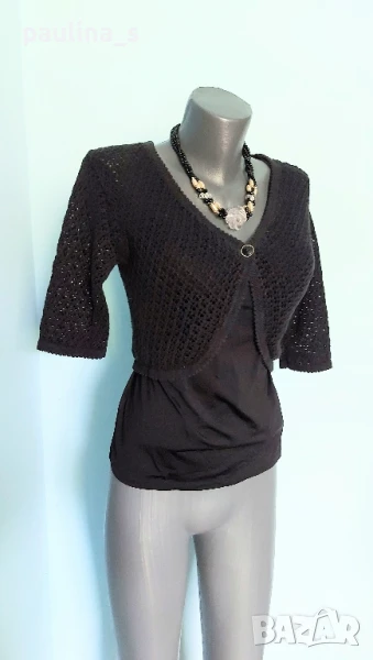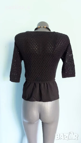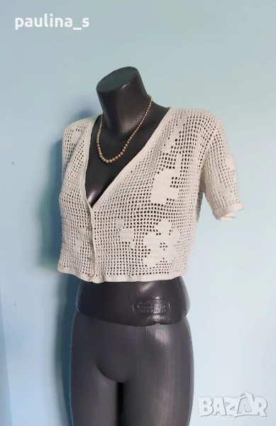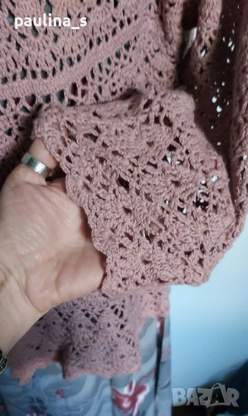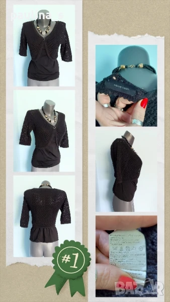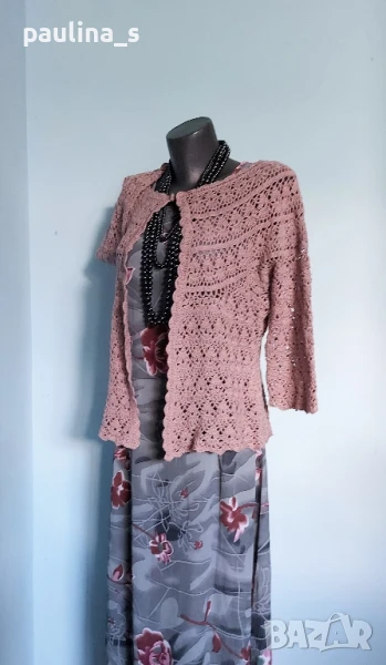 2️⃣. Колаж / L / 2XL - "Hemisphere". Цената е крайна 49,99лв. Дантелен топ тип жилетка от 100% органичен памук. Ръкавите са реглан, 7 / 8 и започват от бието. Скрито закопчаване със секретно копче, отзад е вталена. Цветът е Пепел от рози. Плетивото има еластичност и покрива няколко размера. Без дефекти.