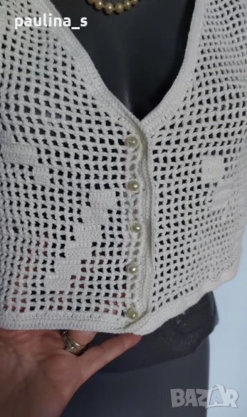 1️⃣. L / 2XL - Ръчно изработен бял топ от памучна прежда. Цената е крайна 54,99лв. Изработката е перфектна и доста трудна. Копчетата са от соца - естествена перла, само те са по-скъпи от обявената цена! Изумителна дреха за ценителки на ръчната изработка с бутикова стойност.