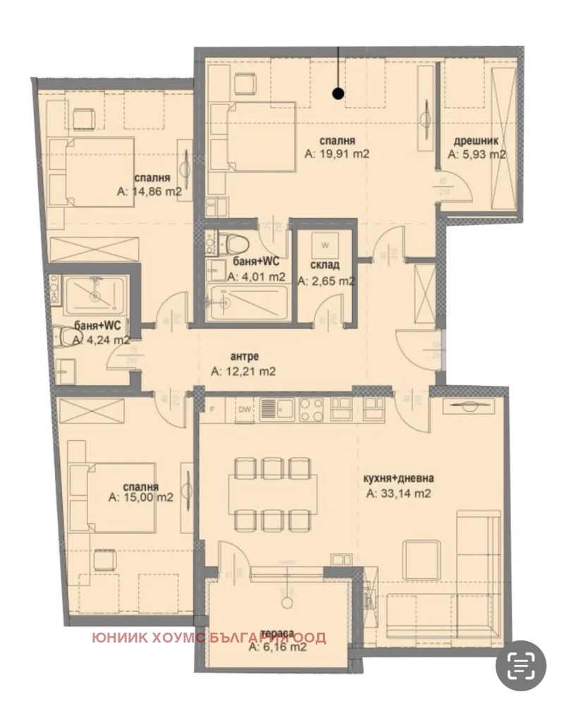 Функционалното разпределение е: антре, дневна с кухненски бокс, две спални, две бани с тоалетни, склад и две тераси.