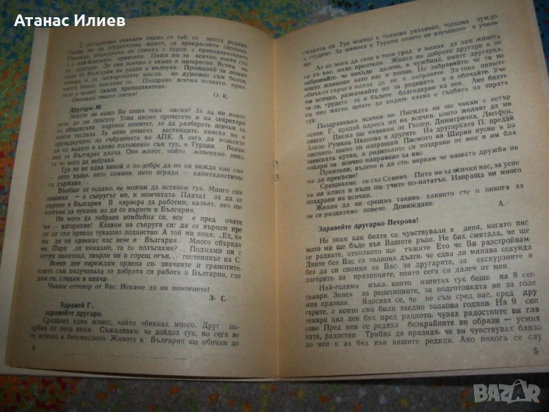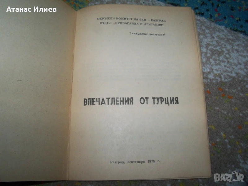 "Впечатления от Турция" и "Писма до родния край" издава окръжния комитет на БКП-Разград отдел "Пропаганда и агитация". Книжката е предназначена само за служебно ползване. Книжката е с меки корици 28+8 стр. Книжката е използвана като пропаганден материал за подготовка на Възродителния процес. Книжката е в отлично състояние.