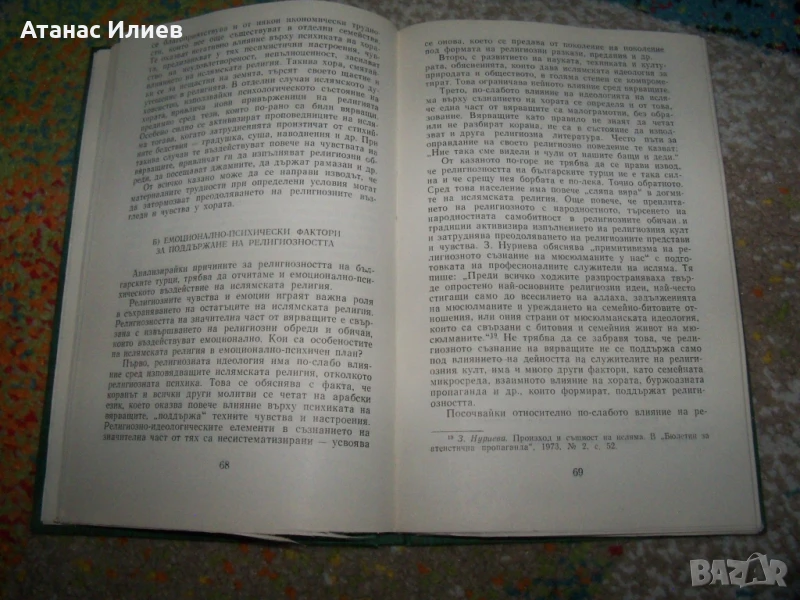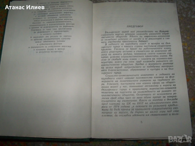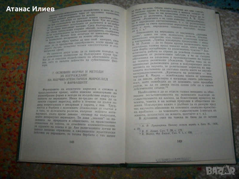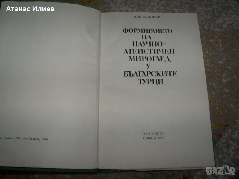 "Формирането на научно-атеистичен мироглед у българските турци" , автор Али Алиев. Книгата е луксозно издание с твърди корици, 170 стр. Издадена е през 1980г от Партиздат. Книгата е в отлично състояние.