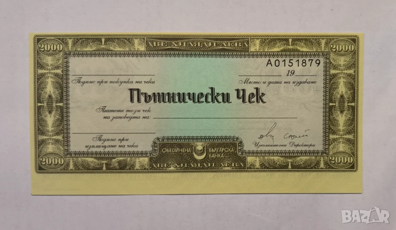 Пътнически чек Обединена Българска банка 2000 лв с воден знак → Обява 50532477