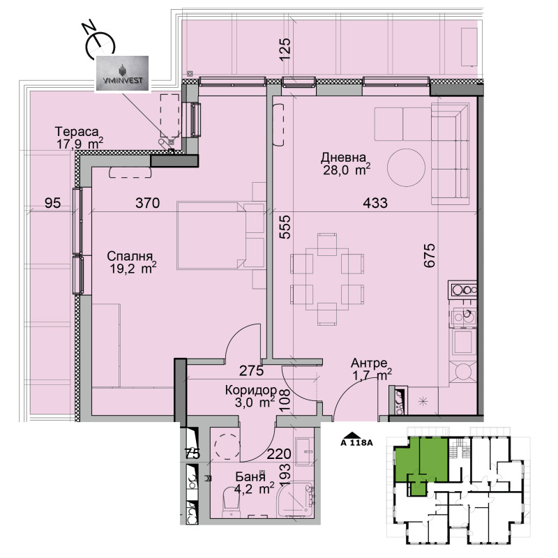 Апартаментът /Ап. 118-А/ е с площ от 103,06 кв.м. и е на пети етаж.