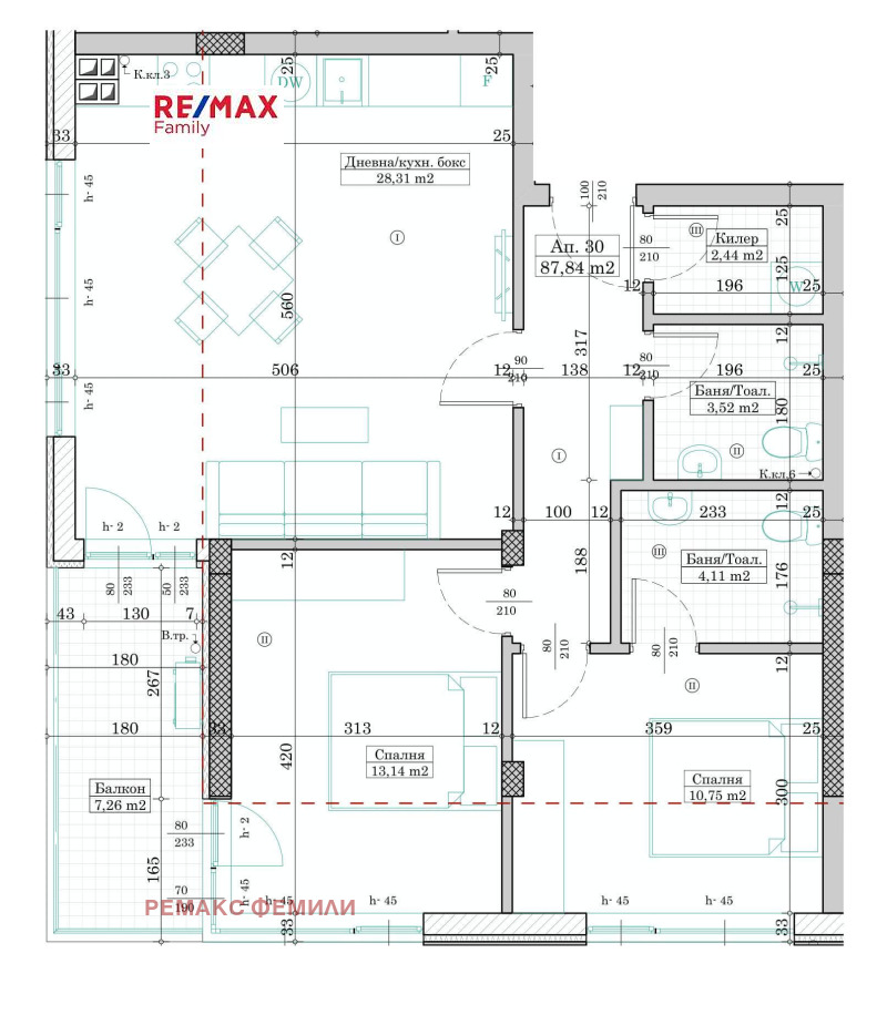 Апартаментът е с обща площ от 102 кв.м, изложение югозапад и има следното разпределение: коридор, дневна с кухненски бокс с площ от 28, 31 кв.м, с излаз на балкон, голяма спалня с площ от 13,14 кв.м и излаз на тераса с площ от 7, 26 кв.м, втора спалня с площ от 10,75 кв.м, две бани с две тоалетни, килер с площ от 5,15 кв.м. Апартамента е разположен на 5-ти жилищен етаж.