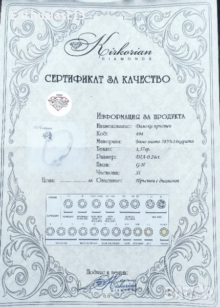 Пръстенът е неупотребяван и е подходящ за специален повод или подарък. Закупен от Kirkorian Diamonds, със сертификат за качество и възможност за еднократна безплатна промяна на размера.