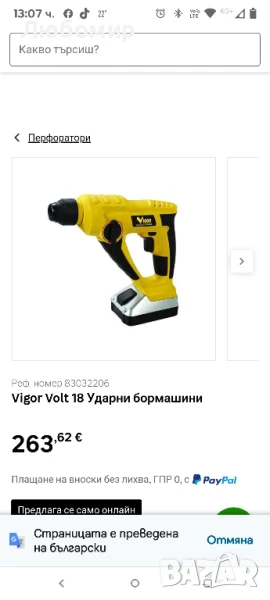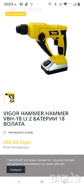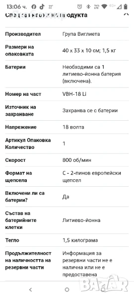 Мострена....Само едната батерия държи.Акумулаторната перфораторна бормашина VBH-18 Lithium Vigor е мощен инструмент за пробиване и закрепване. Захранвана от две 18 V литиеви батерии , тя предлага отлична автономност и производителност. С променлива скорост от 0 до 800 оборота в минута и ударен капацитет от 0 до 5000 удара/мин , тя е идеална за монтаж на анкери с диаметър до 14 мм . Лека и лесна за работа, тежи само 1,5 кг . В комплекта са включени две батерии с капацитет 2600 mAh за удължаване на автономността.