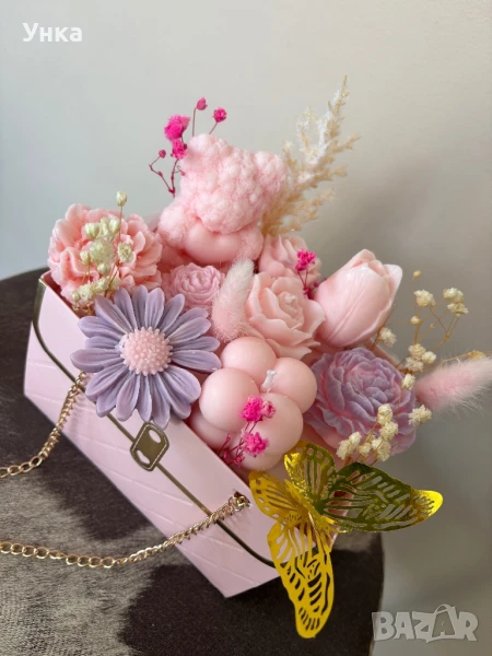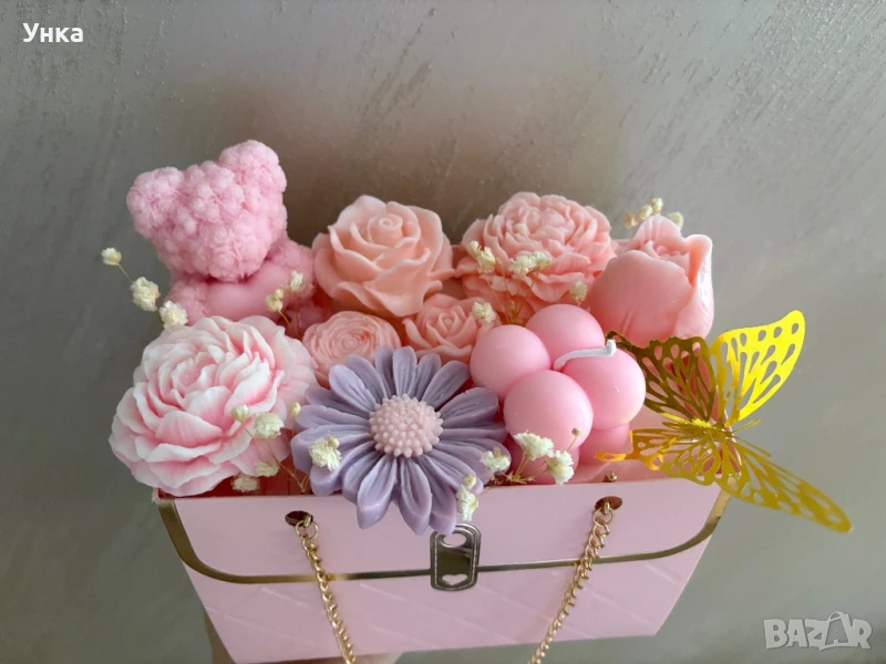 Кошничка с ръчно изработени разнообразни, ароматизирани цветя от соев восък!