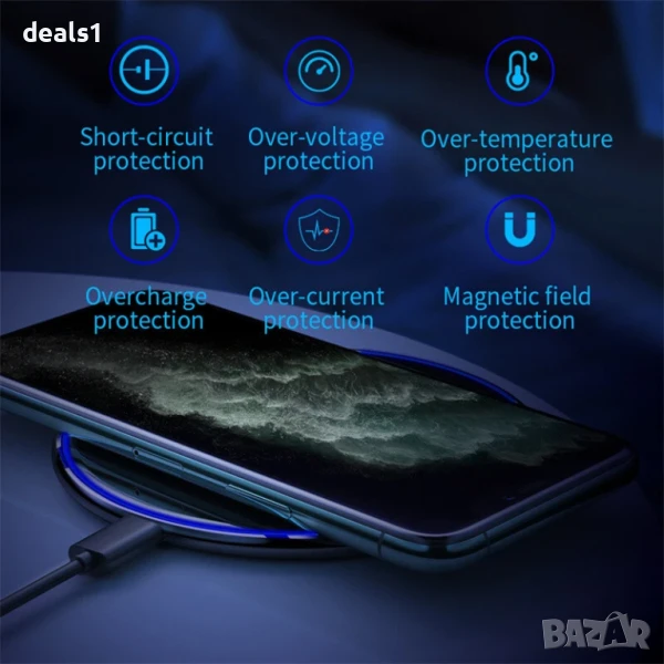Съвместимост: Qi-сертифицирани устройства (iPhone, Samsung, Huawei и др.)