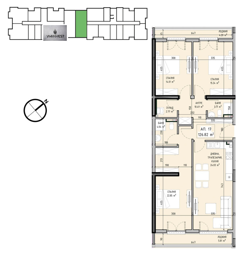 Разпределение: антре /10,49 кв.м./, дневна с кухненски бокс /24,83 кв.м./, спалня /14,01 кв.м./, втора спалня /15,24 кв.м./, трета спалня с дрешник /22,85 кв.м./ и с баня с тоалетна към нея /4,04 кв.м./,втора баня с тоалетна /3,17 кв.м./ складово помещение /2,77 кв.м./ и две лоджии /5,81 кв.м. и 4,20 кв.м./.