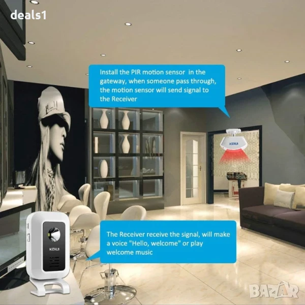 – Визуални сигнали: При открито движение от сензора, приемникът ще издаде звук и LED светлината ще започне да мига, осигурявайки визуален индикатор, който е полезен за хора с нарушен слух.