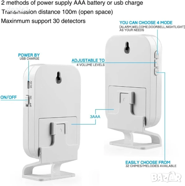 – Разнообразие от звукови сигнали: Приемникът предлага 32 различни мелодии, които могат да бъдат избрани според личните предпочитания. Има 4 нива на звук (високо, средно, ниско, без звук) с диапазон от 0 до 80 dB.