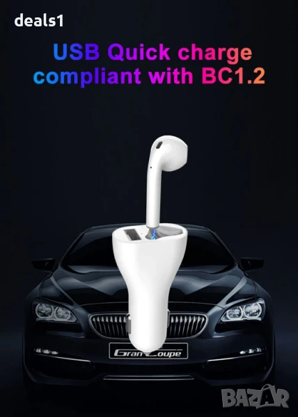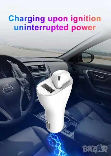 2в1 Безжична Bluetooth Слушалка + Зарядно за кола Хендсфри обаждания и USB порт за бързо зареждане