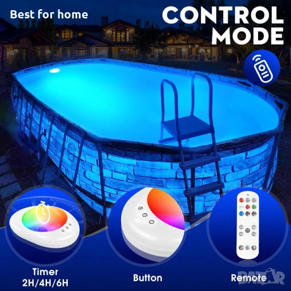 Множество начини за управление - Тази лампа за спа е оборудвана с RF дистанционно управление за по-широк и по-дълбок обхват на управление. Можете да променяте цветовете на светлината, режимите на осветление, да регулирате яркостта и да контролирате скоростта на промяна на светлината чрез дистанционното управление. Освен това, нашата лампа за вана е снабдена с таймер (2 часа, 4 часа, 6 часа), който автоматично изключва устройството в определено време, за да пести енергия. На лампата има 3 бутона за управление, което ви позволява да я управлявате, дори ако дистанционното управление е случайно изгубено.