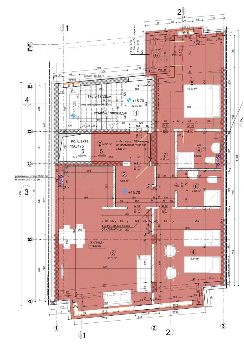Застроената площ е 106 кв.м и общи части 23 кв.м. Общата площ на апартамента е 130 кв.м.