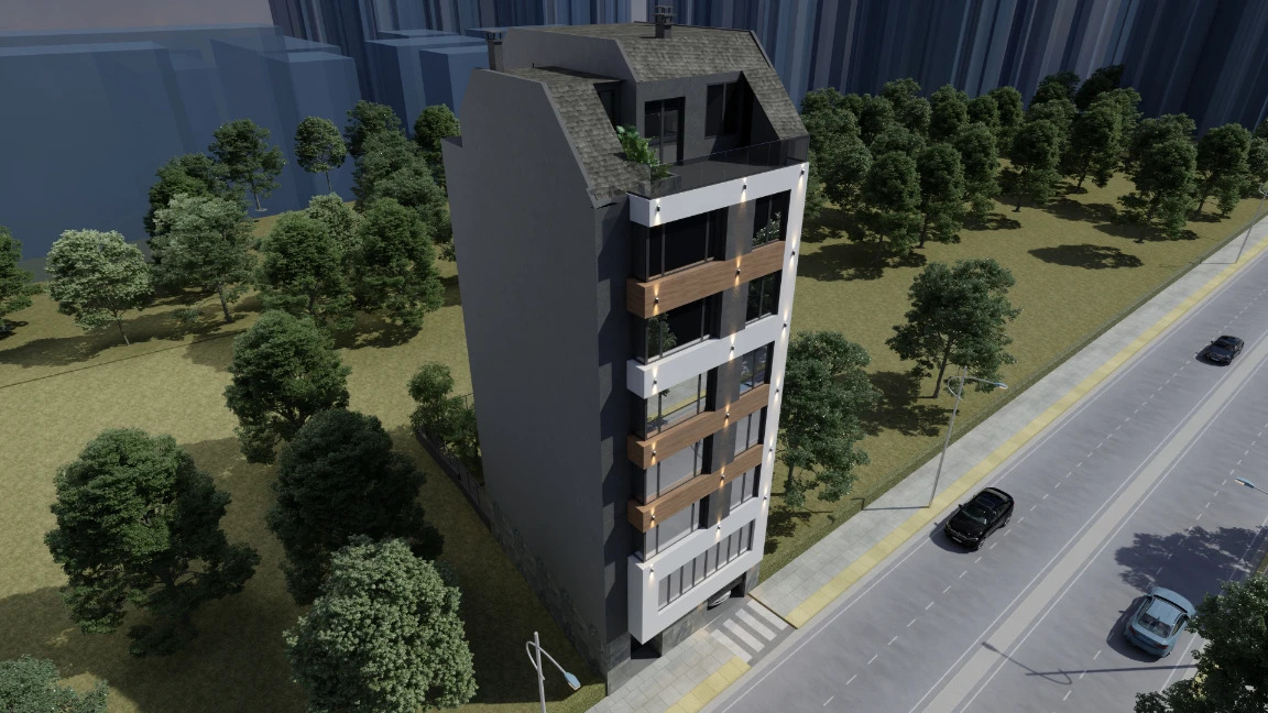Фасадата ще е изпълнена в модерна комбинациия на алуминиев композит, структурна мазилка,дървесен декор и естествен камък.