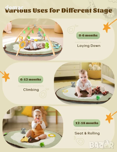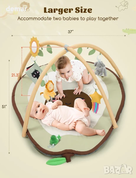 Тази бебешка площадка за игра предлага мека, просторна и безопасна зона, идеална за новородени, подпомагаща двигателните умения, сензорното развитие и ранното когнитивно развитие чрез шест подвижни играчки, включително дрънкалки, гризалки, огледало и платнена книжка. Дизайнът ѝ с форма на авокадо предлага голяма, нехлъзгава, миеща се повърхност за пълзене и време по коремче, а сглобяването без инструменти и подвижните пръти я правят лесна за носене и съхранение. Внимателно проектирана с нежни цветове и очарователни шарки, тя служи и като декоративна мебел за детска стая и като чудесен подарък за млади родители.