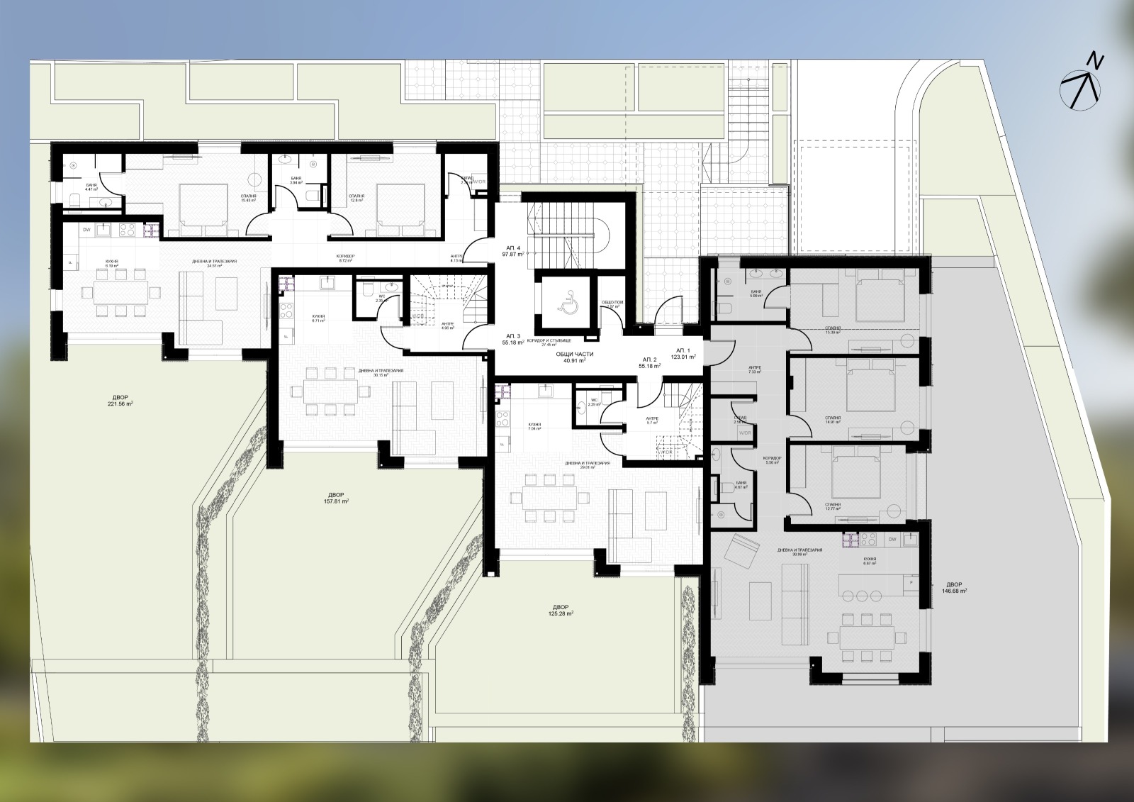 Апартамент 1 e четиристаен апартамент със самостоятелен двор, състоящ се от входно антре, дневна зона с кухненски бокс, три спални и две бани с WC.