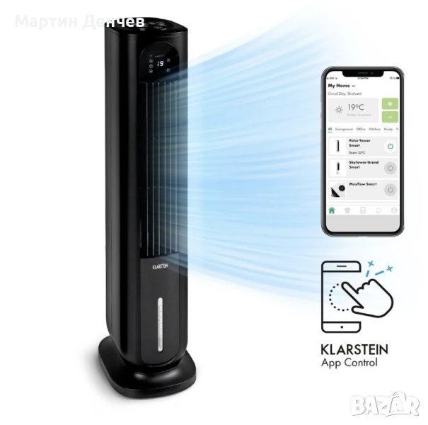 Максимално интелигентно освежаване! Въздушният охладител Klarstein Polar Towar Smart 4-в-1 предлага директно охлаждане през горещите летни дни. Като вентилатор, охладител, овлажнител и пречиствател на въздуха в едно, той се грижи за освежаващия въздушен поток и приятното прохлаждане навсякъде.Особено умен, когато става въпрос за охлаждане. Благодарение на WiFi връзката може лесно да управлявате въздушния охладител Klarstein Polar Tower Smart чрез вашия смартфон или iPhone и навсякъде. Разбира се, че може също така да настроите и приятен въздушен поток напълно индивидуално чрез контролния панел или дистанционното управление. Четирите скорости на издухване, превключващо се хоризонтално трептене и таймер, регулируем на часови стъпки до 24 часа, всичко това позволява прецизна настройка към актуалните изисквания за освежаване. Klarstein Polar Tower Smart допълнително предлага три режима на работа. В допълнение към нормалният режим, естественият режим симулира по-силен и по-слаб вятър. Нощният режим работи на подобен принцип, но постепенно намалява максималната скорост на вятъра, докато устройството се изключи. Klarstein Polar Tower Smart също така се е доказал като пречиствател на въздуха. Функцията за превключване на йонизация премахва праха и миризмите от въздуха и ви позволява да дишате свободно.В комбинация с функцията на охладителя, освежаващият ефект е допълнително подобрен. Въздухът от околната среда се охлажда, като се използва естественият принцип на изпаряване на водата: въздушният охладител 4 в 1 всмуква топъл въздух от задната страна на устройството и го овлажнява. По този начин изходящият въздушен поток се охлажда чрез естественото изпаряване на водата. Това предлага охлаждане на тялото по време на всяка дейност. Освен това въздухът се овлажнява, което води до отделяне през горещите дни или със сух въздух за отопление. За да се постигне продължителна работа, резервоарът за вода може да се напълни с до 7 литра вода. До пет сменяеми охлаждащи батерии при поискване ще понижат температурата на водата за още по-голямо освежаване. Резервоарът за вода може да бъде напълно отстранен за по-лесно пълнене, почистване и изпразване. С обща консумация на енергия от 85 вата, Polar Tower Smart е екологична алтернатива на климатика при продължителна работа.