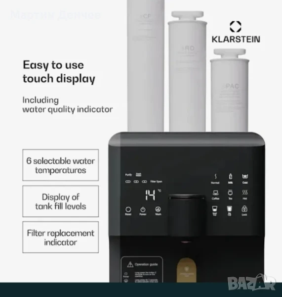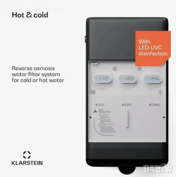 Пречиствател на вода Klarstein, 5-степенна филтрация, обем 6 л, 6 темпПречиствател на вода Klarstein, 5-степенна филтрация, обем 6 л, 6 темп - 2Пречиствател на вода Klarstein, 5-степенна филтрация, обем 6 л, 6 темп - 3Пречиствател на вода Klarstein, 5-степенна филтрация, обем 6 л, 6 темп - 4Пречиствател на вода Klarstein, 5-степенна филтрация, обем 6 л, 6 темп - 5Днес в 13:33 ч.Пречиствател на вода Klarstein, 5-степенна филтрация, обем 6 л, 6 темп850 лв.Доставката се поема от: купувачаСъстояние: новоОписание5-степенна филтрация: Предварителният филтър 2 в 1 (утайка + активен въглен) премахва пясъка, ръждата, хлора и миризмите;Обогатяване с водород: за премахване на свободните радикали и обогатяване с антиоксидантиМодерен дизайн на плота: Компактен, преносим, подходящ за всяка кухня благодарение на лесния монтаж без водоизточник или пробиванеПречиствателят за вода Klarstein AquaFina 6L прави революция в пречистването на водата с иновативната си система за обратна осмоза и други функции. Благодарение на тристепенната си система за филтриране и петте степени на пречистване тя гарантира свежа и вкусна вода. Системата се състои от предфилтър 2 в 1, мембрана за обратна осмоза и постфилтър 2 в 1.Особено внимание заслужава обогатяването на водата с водороден газ без вредни странични продукти. Изключително малките водородни молекули могат да елиминират свободните радикали и да повишат антиоксидантните свойства на водата.От техническа гледна точка пречиствател на вода Klarstein AquaFina 6L впечатлява с 6-литров резервоар, модерен настолен дизайн и лесен монтаж без връзка с вода. HD сензорният екран ви позволява да избирате 6 различни температури на водата и показва качеството на водата.Безопасността е гарантирана от детска ключалка, която следи потреблението на вода и задейства аларма, когато резервоарът за прясна вода е празен или резервоарът за отпадъчна вода е пълен. С три филтъра с дълъг живот (PAC до 12 месеца, RO до 24 месеца, активен въглен до 12 месеца), ефективен капацитет на филтриране от 30 литра на час и нисък коефициент на дебит, пречиствателят за вода Klarstein AquaFina 6L съчетава иновативна технология, удобство за потребителя и ефективност.